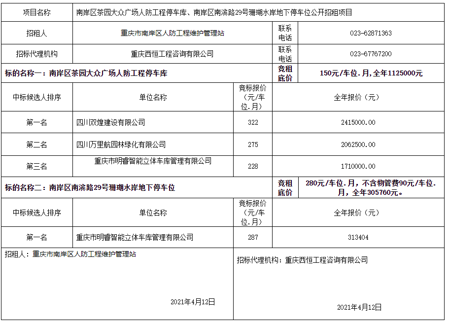 南岸区茶园大众广场人防工程停车库、南岸区南滨路29号珊瑚水岸地下停车位公开招租项目中标候选人公示(公示期:2021年4月12日—— 2021年4月14日)注:1.招租人及其委托的招标代理机对填写的中标候选人公示内容的真实性、准确性和一致性负责。2.发布媒介应当对所发布的公示信息的及时性、完整性负责。